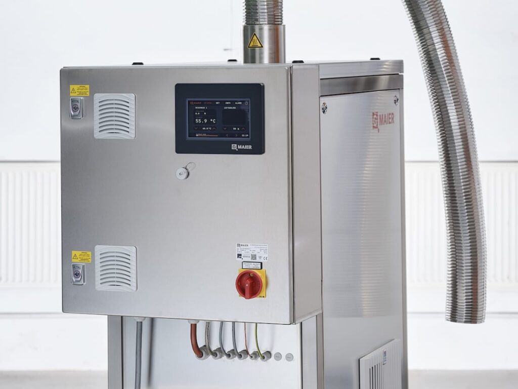 Hier wird Raumluft unten angesaugt und oben ausgeblasen. Das Lufterhitzeraggregat arbeitet höchst präzise und ist aufgrund der fahrbaren Bauweise universell einsetzbar. Über die Kommunikations-Schnittstelle OPC-UA wird die Prozesssicherheit dokumentiert.